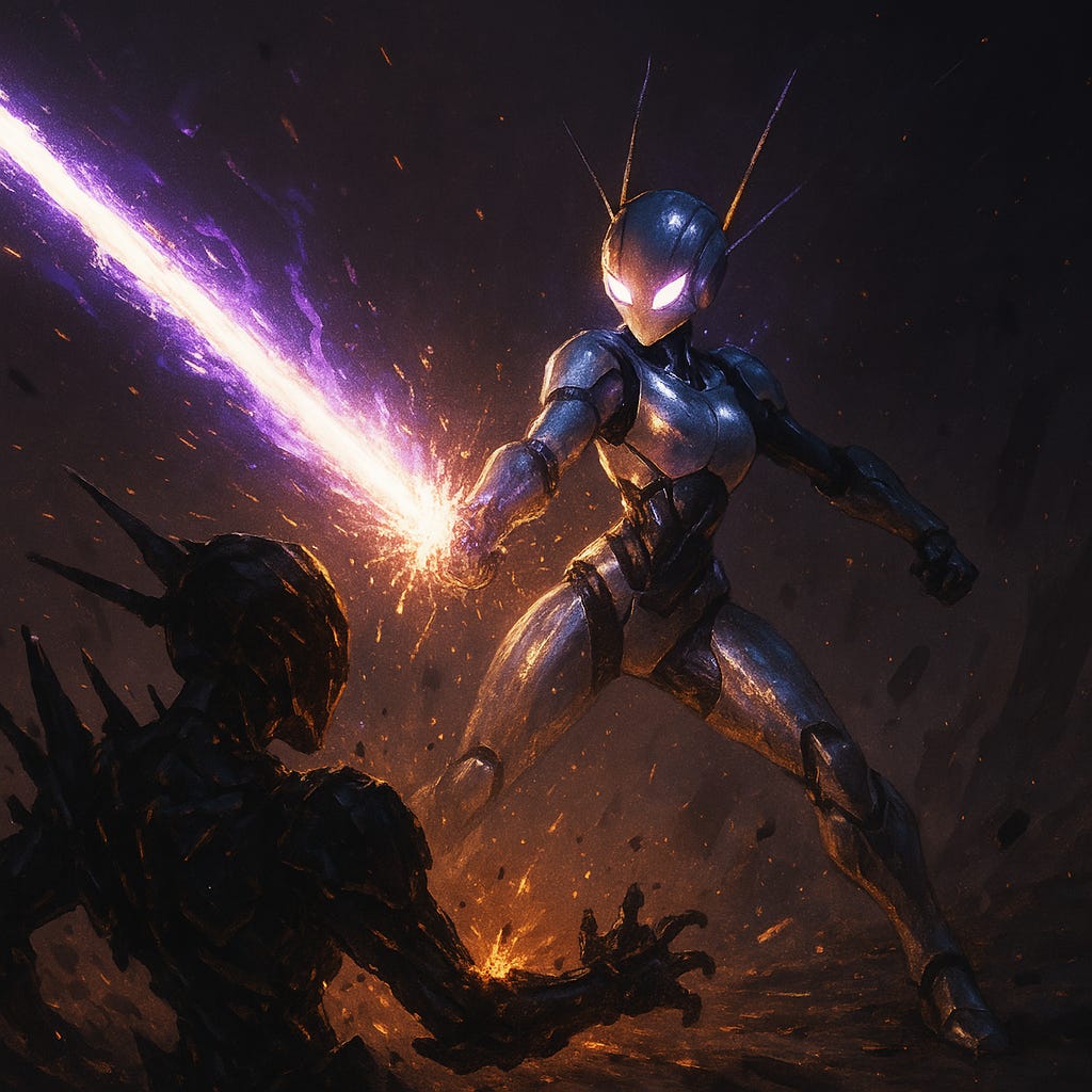 Eclipse’s glow pulsed in fury, she was back against the wall of the chamber and exploded toward her enemy— a violet blade erupting from her arm cannon she slashed with a fury. A cyclone of devastation. The enemy’s velocity projectiles met with obliteration, those deflected finding a new vector, one aimed directly at the abominations brittle core shielded inside it’s black galaxy hued body. Every concussive contact forcing the creature to devote more power to maintaining its integrity.